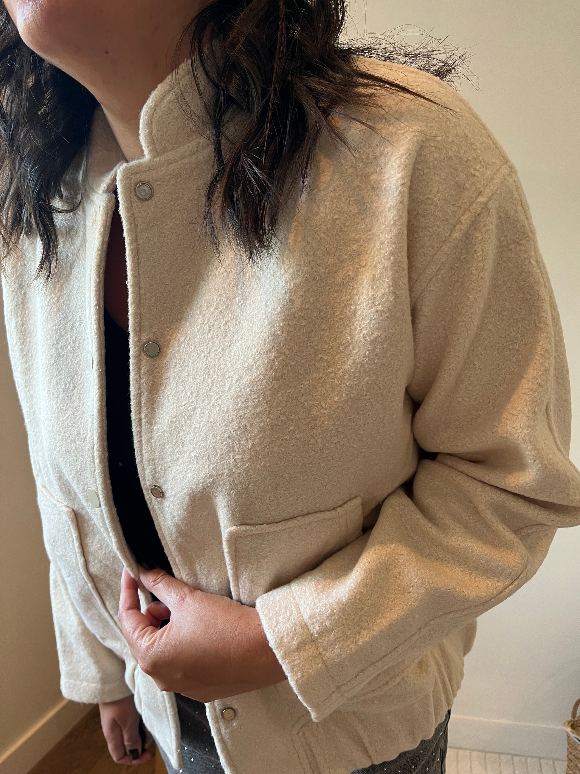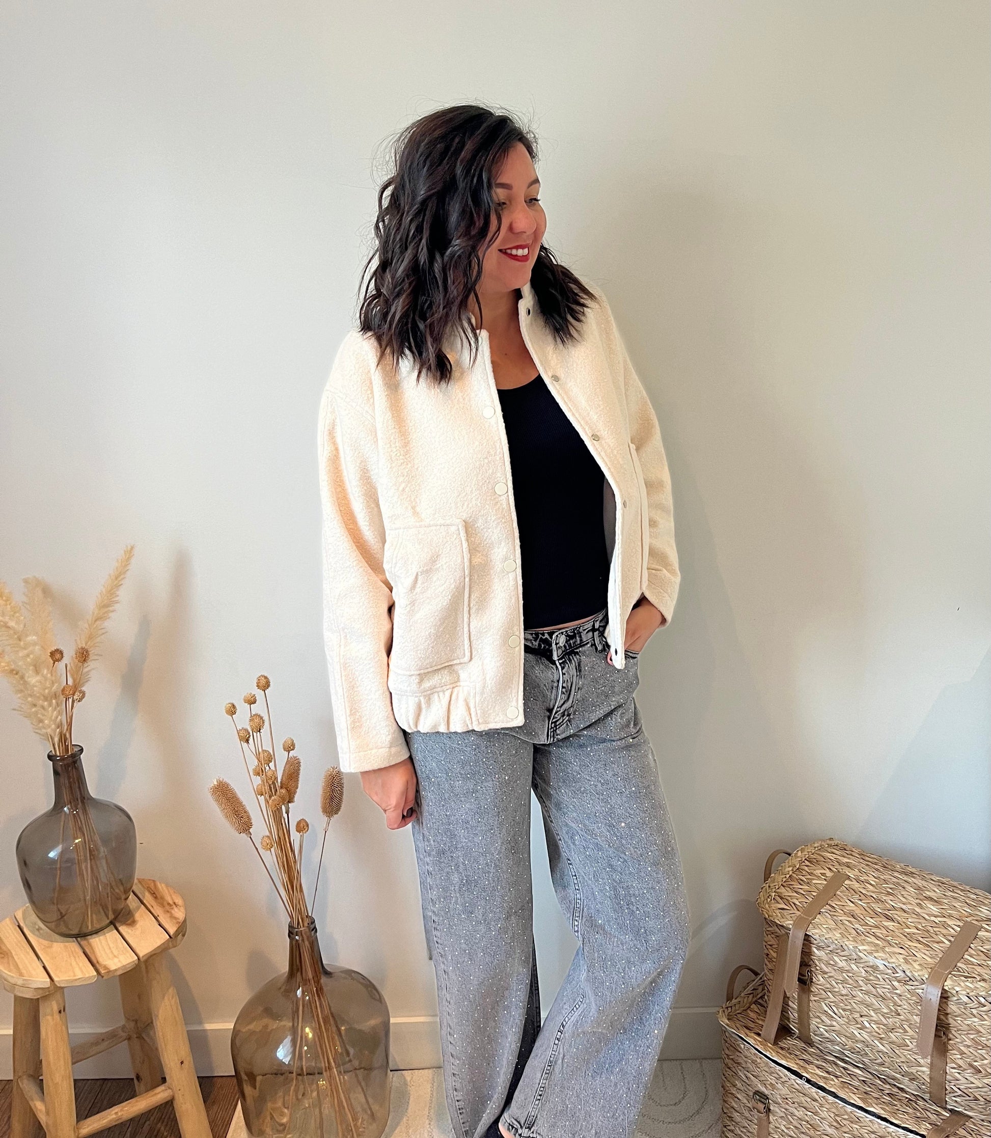 Un cocon de douceur au style affirmé. Ce bomber crème en bouclette offre une chaleur enveloppante. Sa texture effet mouton apporte du relief et une touche tendance, tandis que sa coupe courte et ses finitions soignées assurent un look urbain et raffiné.