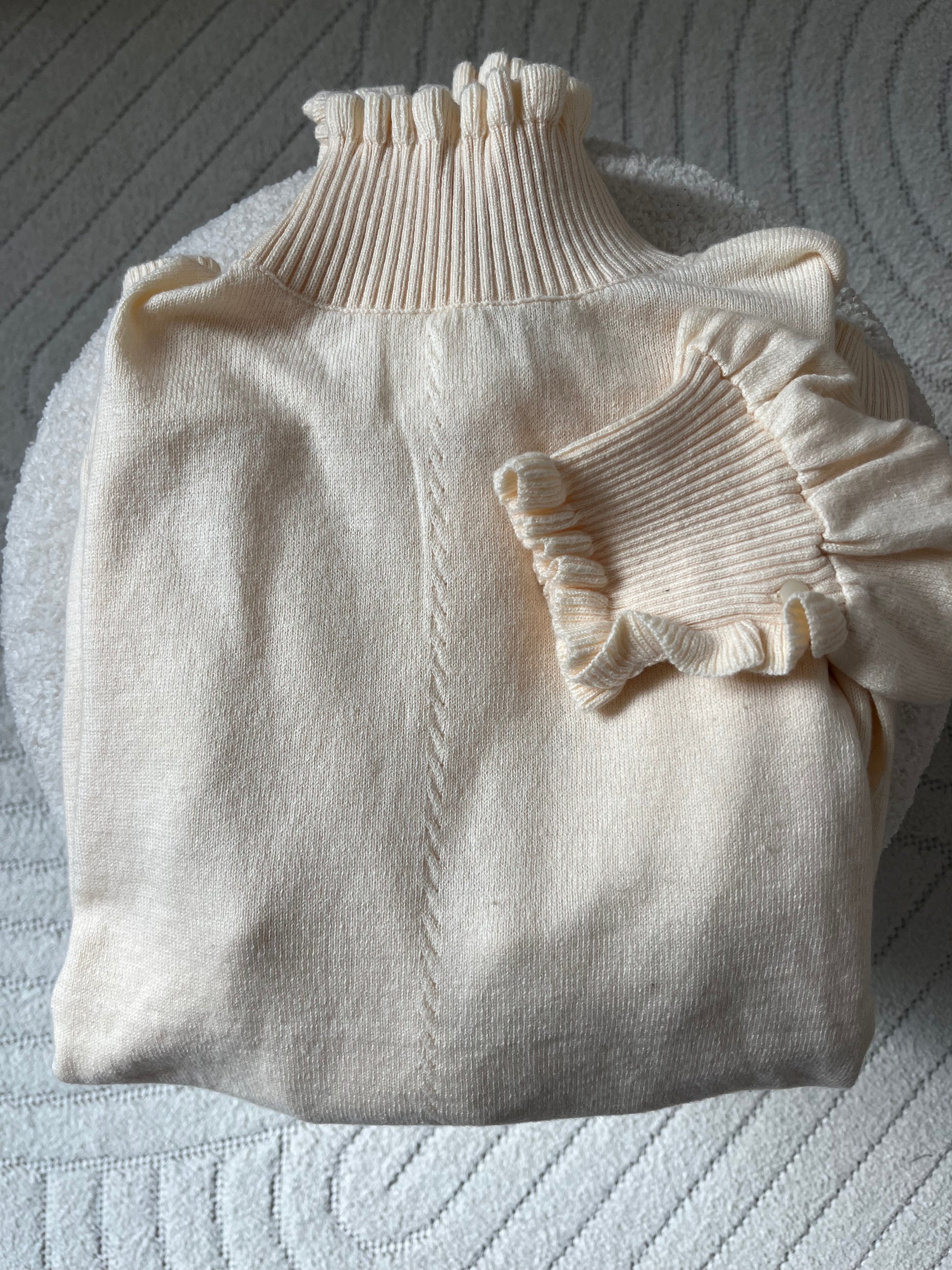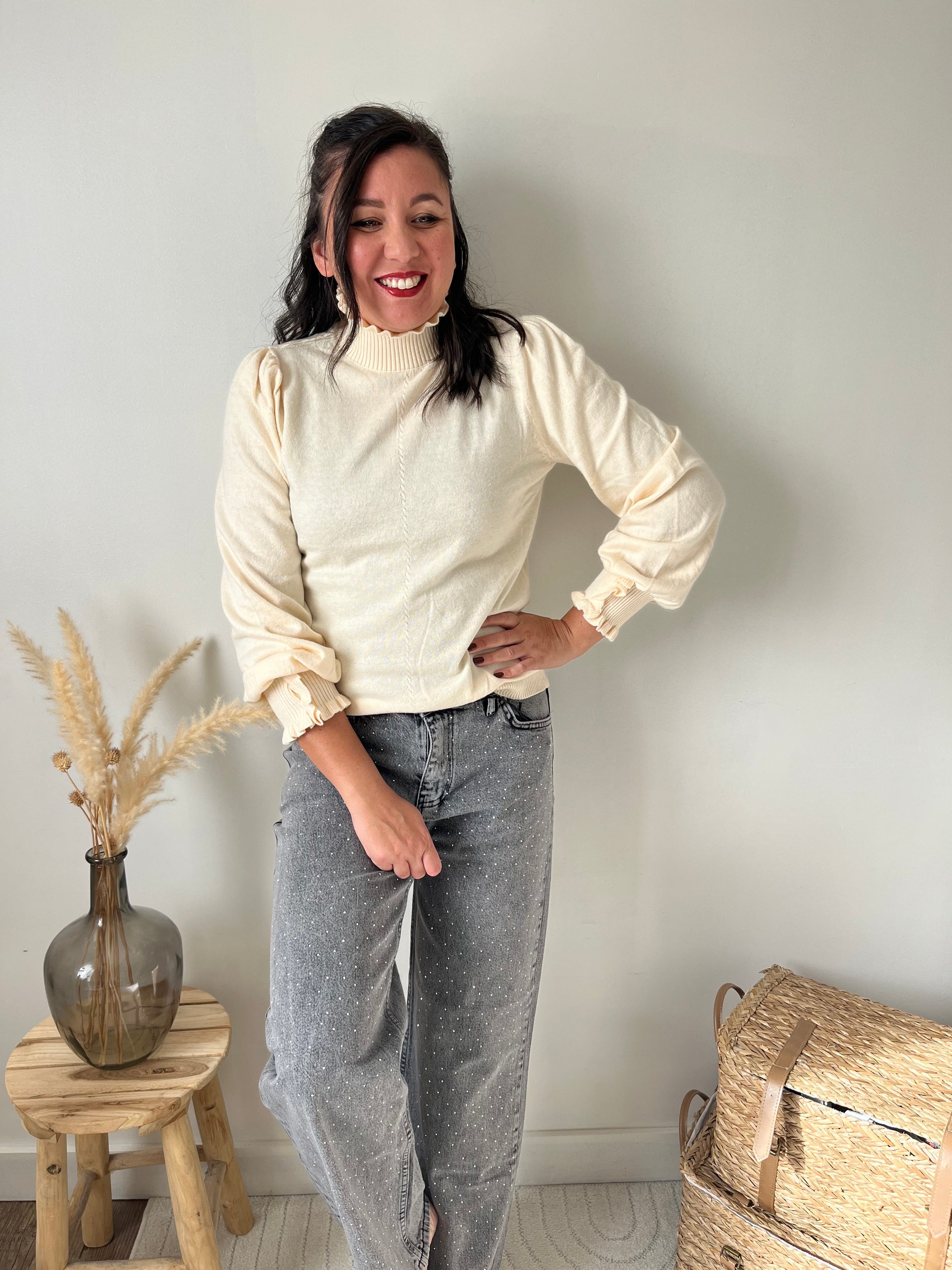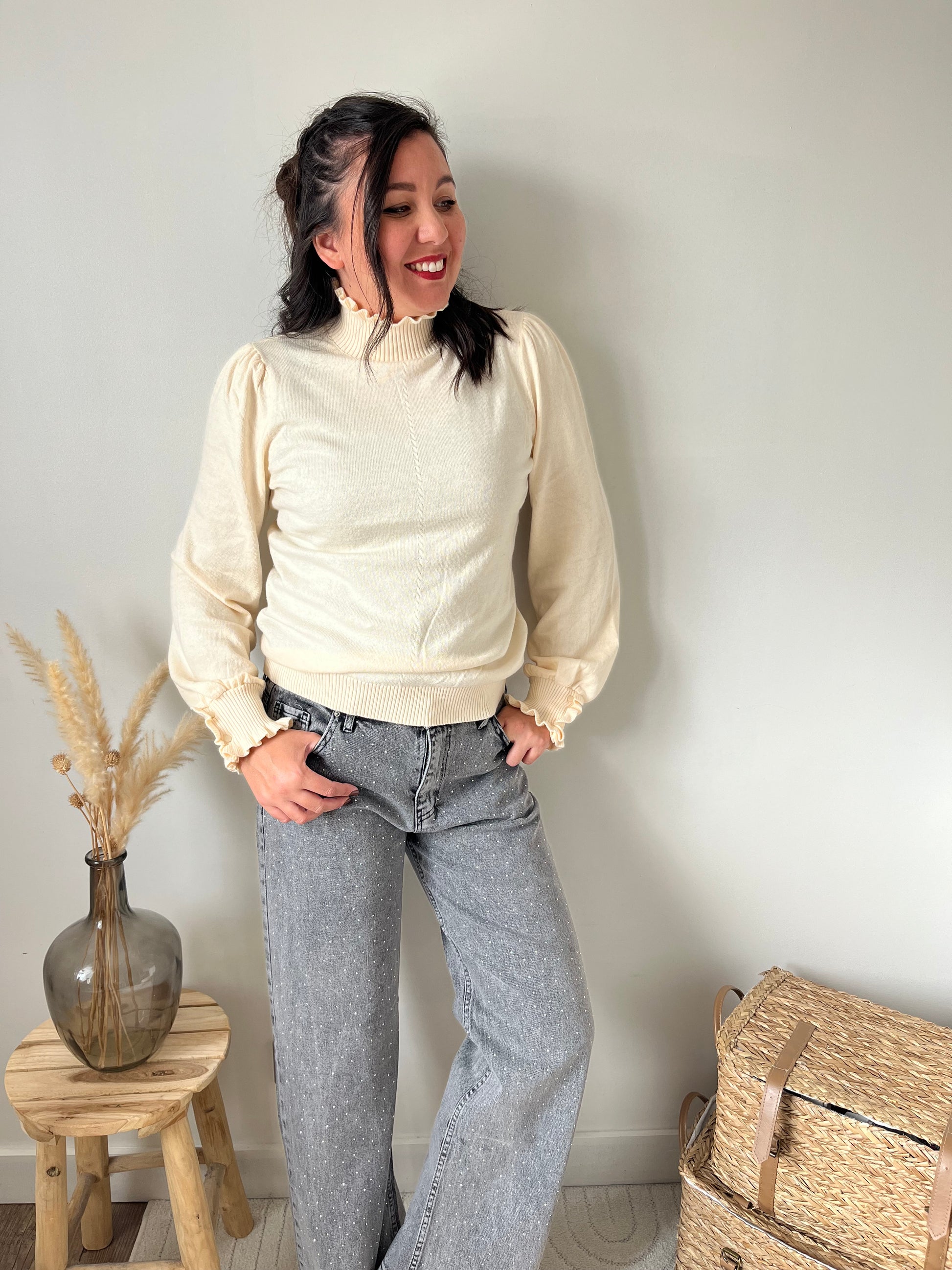 Ce col roulé "Amy" avec son col froncé apporte une touche romantique et structurée, tandis que ses manches travaillées ajoutent du relief à la silhouette. Confectionné dans une maille douce contenant de la laine, il offre chaleur et élégance au quotidien.