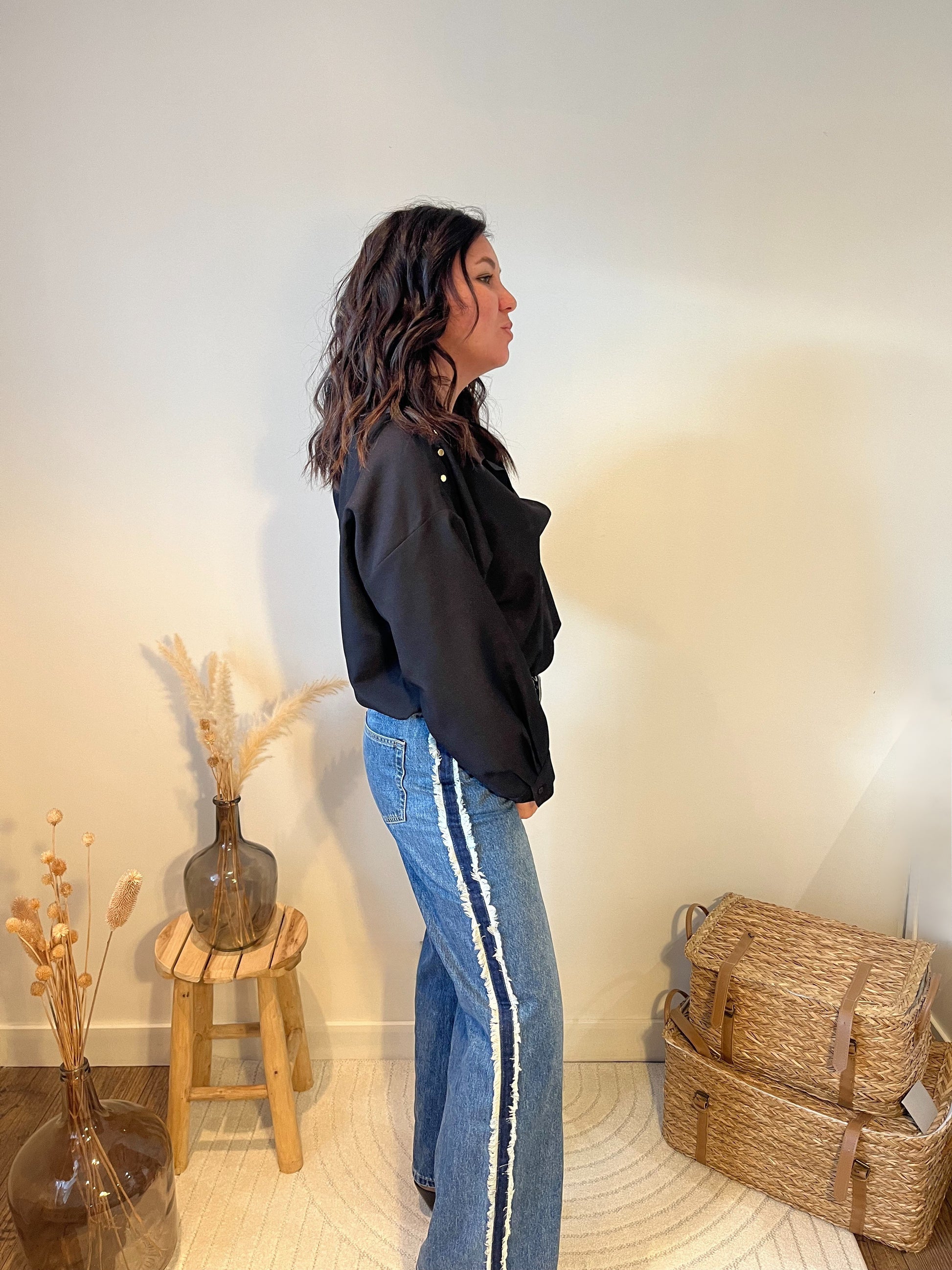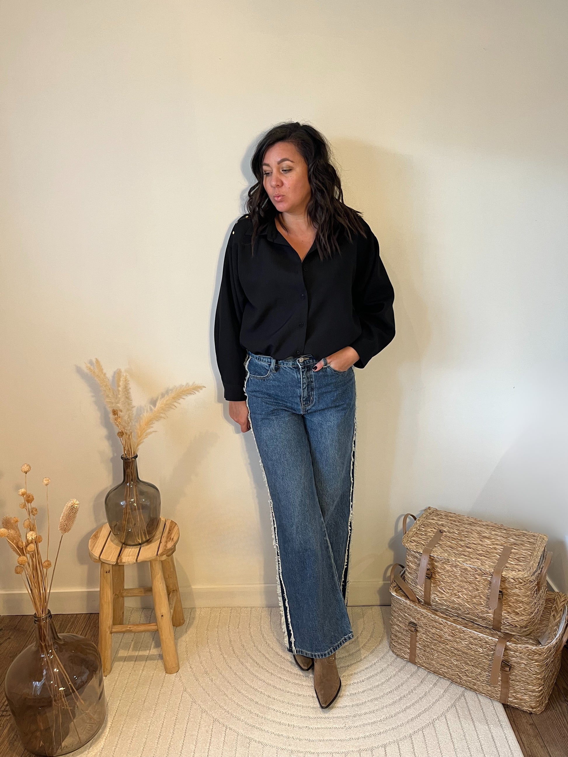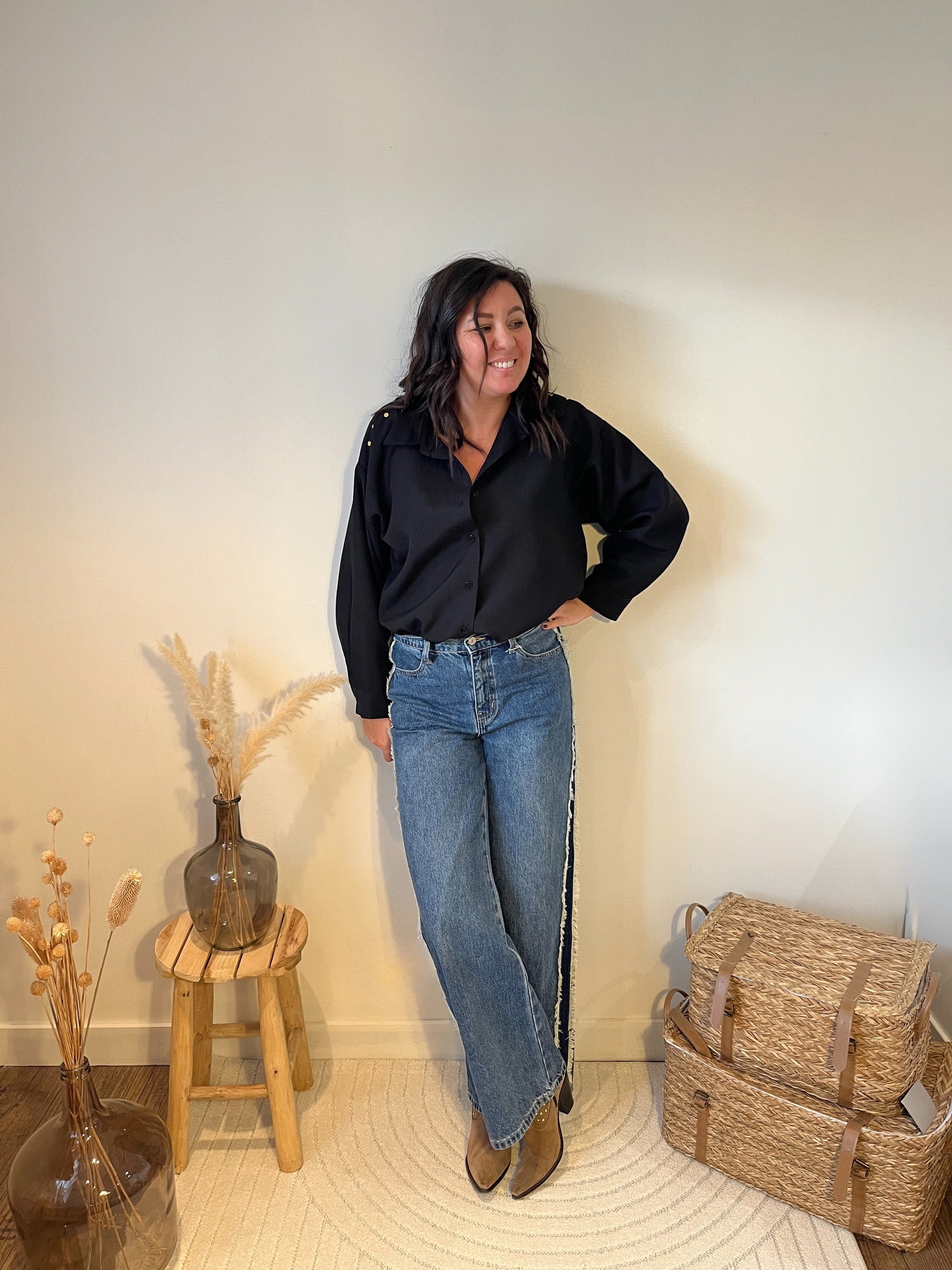 Jean droit au style moderne, rehaussé d’une bande décorative et de franges le long des coutures latérales. Une pièce originale qui apporte une touche tendance à une silhouette classique.