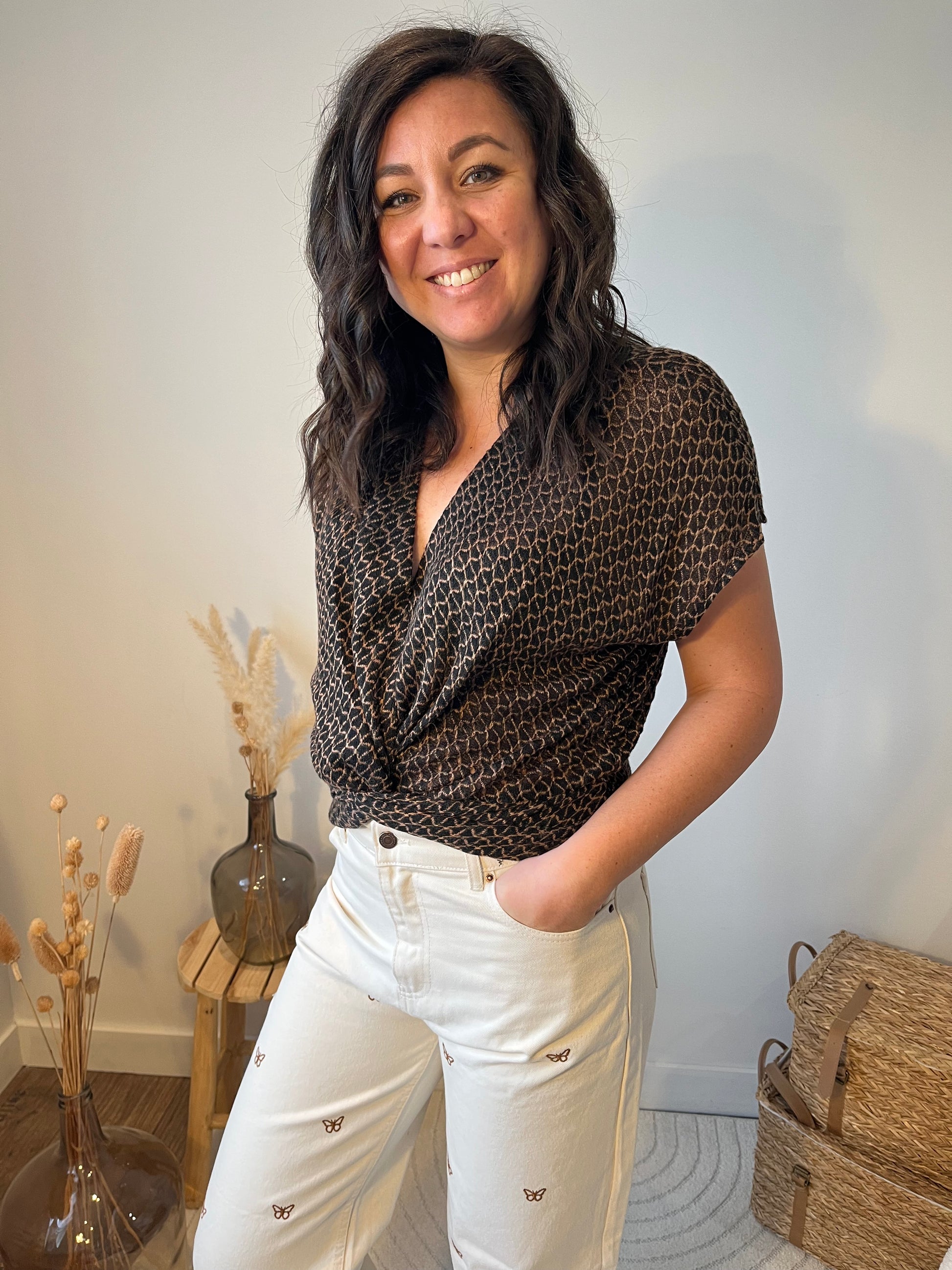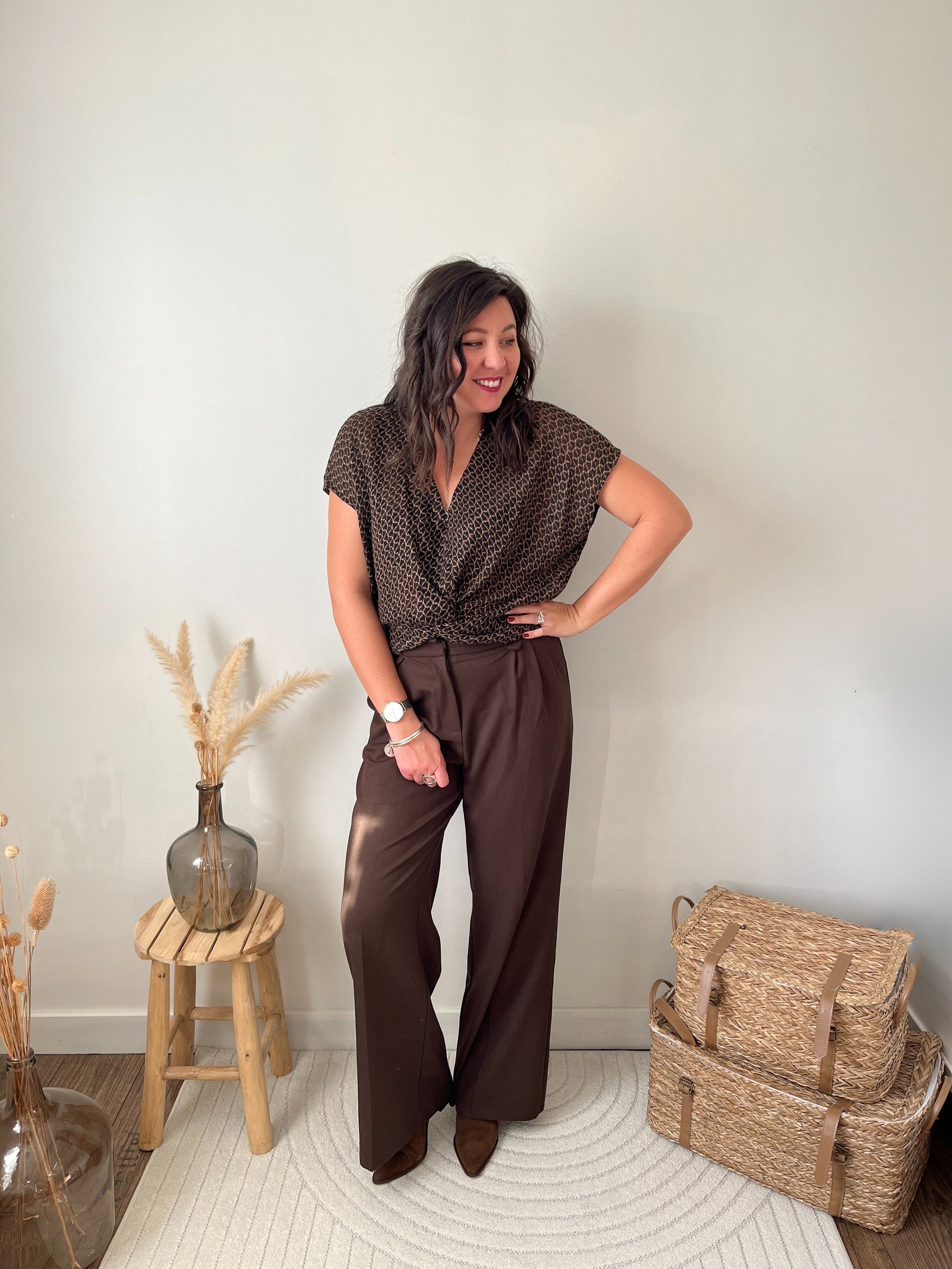 Sur les photos le top est associé au pantalon Avy crème et au pantalon de tailleur Béa marron.